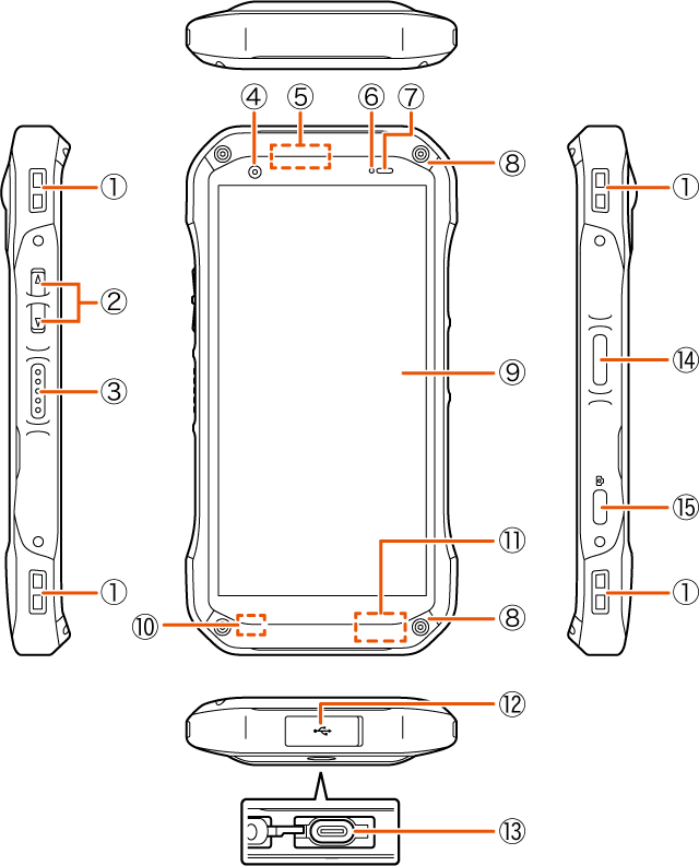通話中の相手の方にこちらの声を伝えます。また、音声を録音するときにも使用します。通話中や動画の録画中は、送話口(マイク)/気圧センサーを指などで覆わないようにご注意ください。
