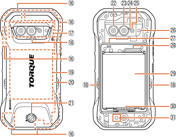 ディスプレイ(タッチパネル)保護のために正面スクリーンが貼られています。破損したときや古くなったときには別売の正面スクリーン(KYG06KGA)と交換することができます。 |
