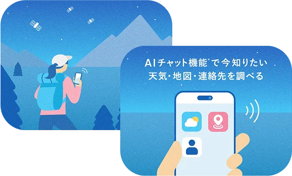 ★3:対象機種にて、iOSメッセージアプリ/Googleメッセージアプリ上でテキストメッセージ送受信可能(写真・動画・電子ファイル添付可能【一部機種を除く】) 。対象機種にて一部アプリ(YAMAP、ウェザーニュース注等複数アプリ)のデータ通信が可能。音声通話は未対応。(2025年9月時点)注:iOS向けは今後提供予定