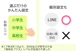 レベルを選ぶだけのかんたん設定から個別設定まで、制限範囲を柔軟に調節できます。