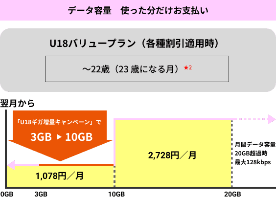- 本プランは23歳になる月の翌月から、データ容量によりご利用料金が変動せず20GBまで定額で使えます。データ利用量が「10GB以下(通常3GB以下)」の場合も月額料金は料金表内の「10GB超~20GB(通常3GB超~20GB)」の金額です。プラン料金、その他の提供条件には変更の可能性があります。