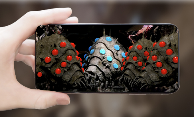 王蟲の近くに設置されたマーカーにスマートフォンをかざすと、王蟲に何かが起こる?ぜひあなたの目で確かめて。