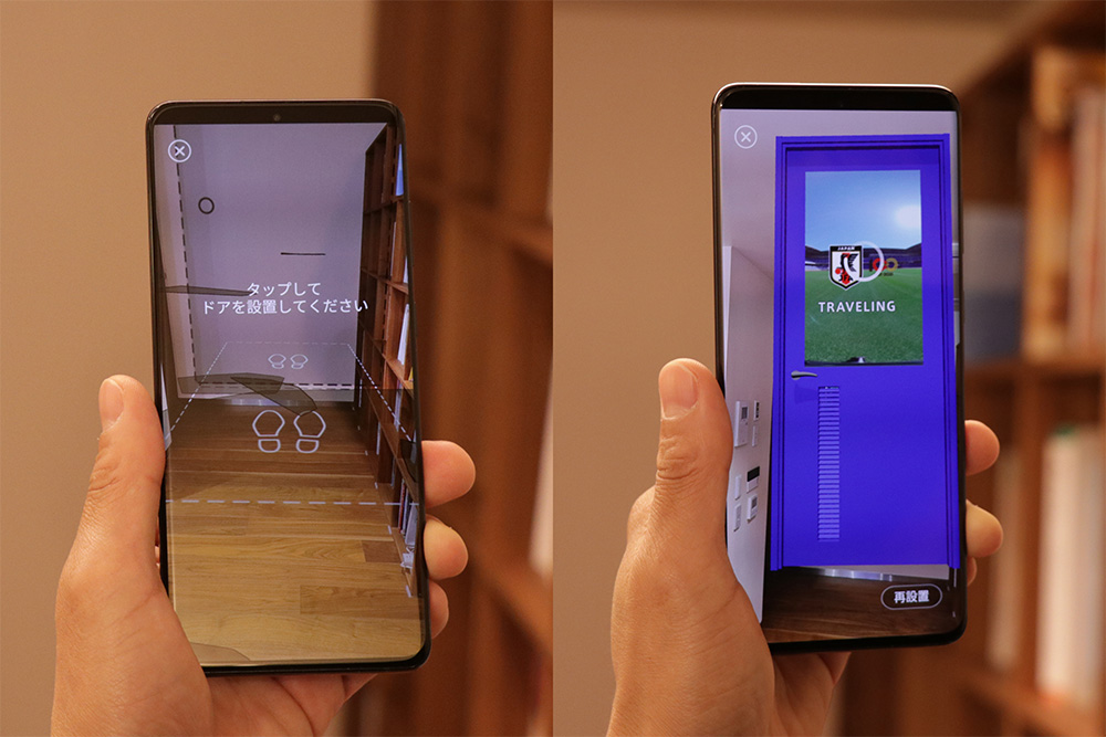 「アクティブモード」を選択するとスマートフォンのカメラが起動し、表示される手順に従って画面をタップしていくとカメラが映し出す現実空間に仮想の青いドアが出現。