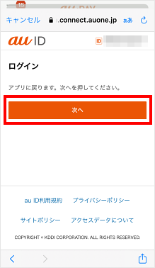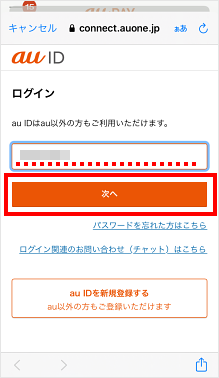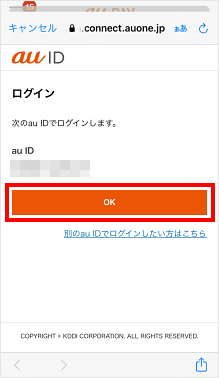au IDに紐づく電話番号宛てに届いた確認コードを入力し、[ログイン]をタップします。