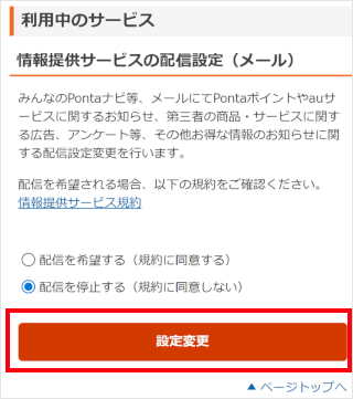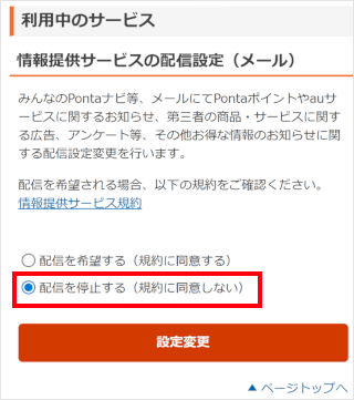 au IDサイトの「情報提供サービスの配信設定」ページで停止ができます。