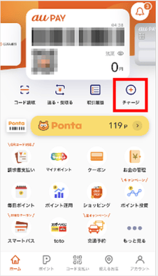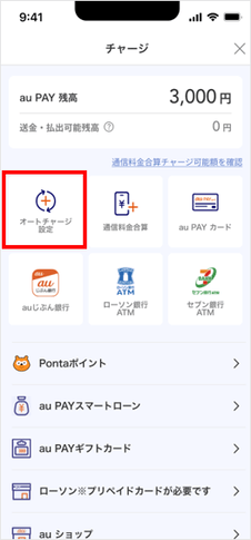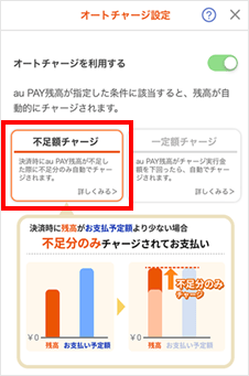 「au PAY アプリ」を起動し、チャージ画面で不足額チャージの設定ができます。