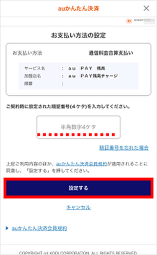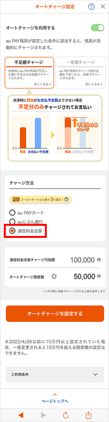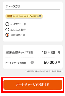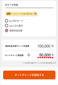 チャージ方法を「au PAY カード」「auじぶん銀行」「通信料金合算」の中から選択します。