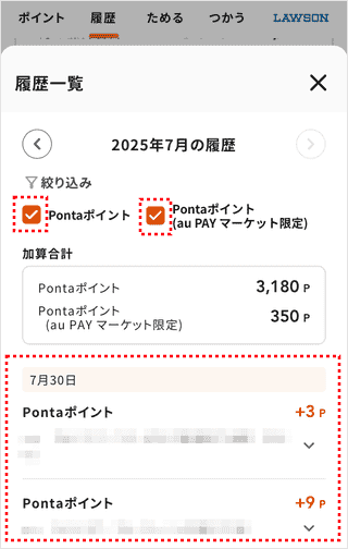 「履歴一覧」では「Pontaポイント」、「Pontaポイント(au PAY マーケット限定)」を選択してポイントを確認できます。