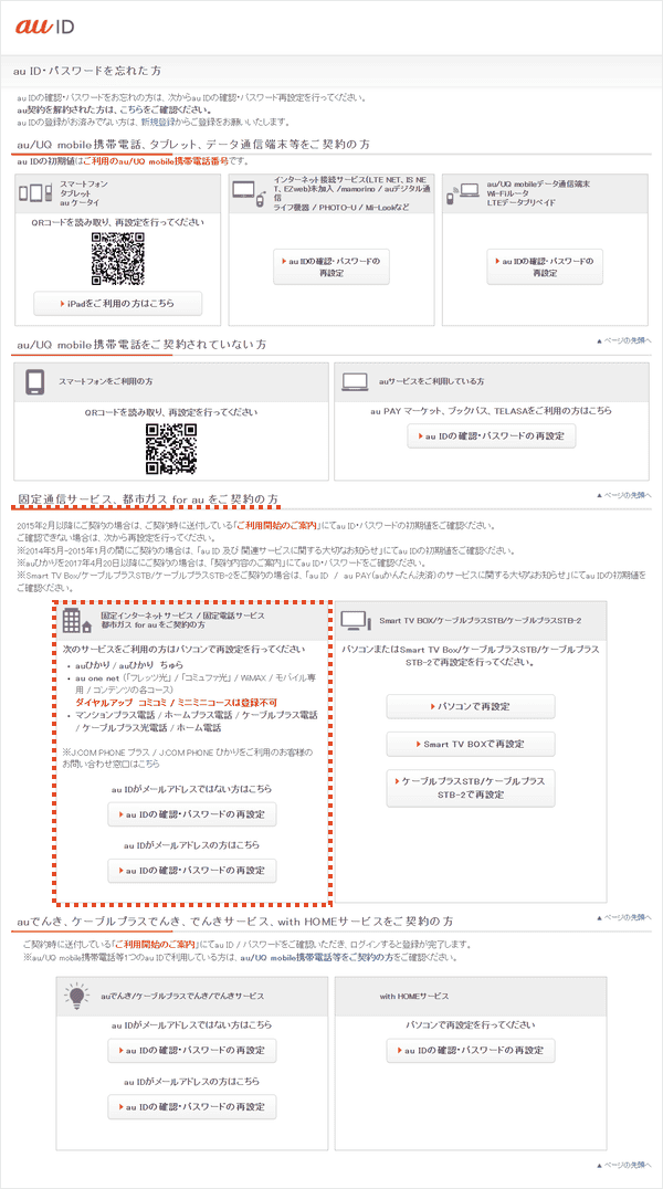 [固定通信サービス、都市ガス for au をご契約の方]→[au IDの確認・パスワードの再設定]よりお手続きください。