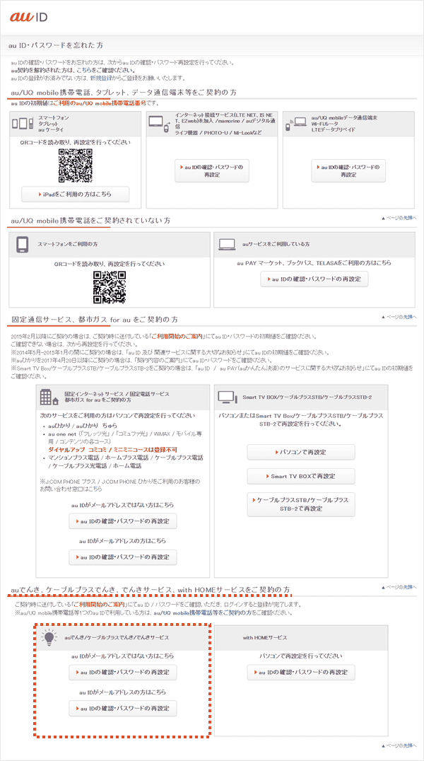 [auでんき、ケーブルプラスでんき、でんきサービス、with HOMEサービスをご契約の方]→[au IDの確認・パスワードの再設定]よりお手続きください。