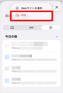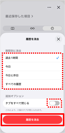 削除したい期間を選択し、[履歴を消去]をタップします。 ※今回は例として「すべての履歴」を選択します。 ※[タブをすべて閉じる]をオンにした場合は、開いているタブがすべて削除されます。