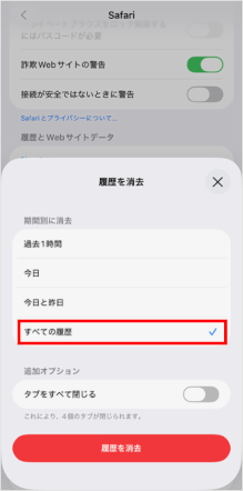 [すべての履歴]をタップします。 ※過去1時間など、期間別に消去することもできます。 ※iPadでは「消去」と表示されます。