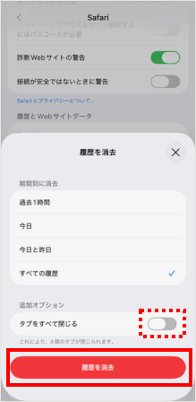 [履歴を消去]をタップします。 ※開かれているタブもすべて閉じたい場合は[タブをすべて閉じる]のスイッチをタップしてオンにします。