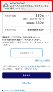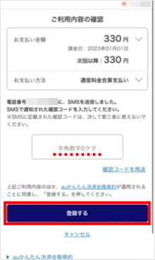 「確認コード」を入力し、[登録する]をタップします。 ※UQ mobile/povo2.0のお客さまの場合、「通信料合算支払い」「クレジットカード支払い」「au PAY カード支払い」を選択できます。
