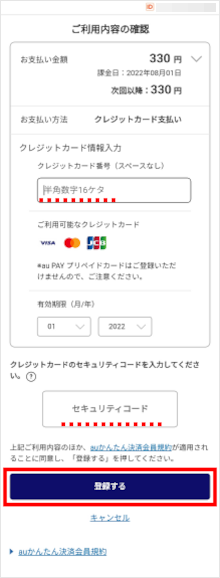 クレジットカード番号とセキュリティコードを入力し、[登録する]をタップします。