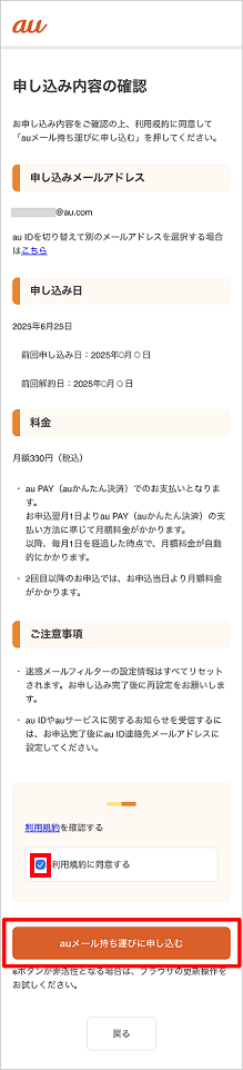 「利用規約に同意する」にチェックを入れ、[auメール持ち運びに申し込む]をタップします。