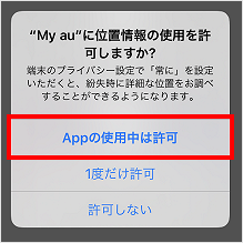 位置情報許可ダイアログ[アプリの使用時のみ][今回のみ][許可しない]のいずれかをタップします。 ※この画面でどれを選んでも、次以降の画面で再度選択し決定することになります。 ※この画面が表示されない場合は次の手順に進みます。
