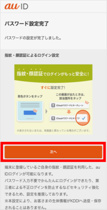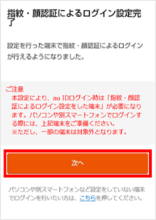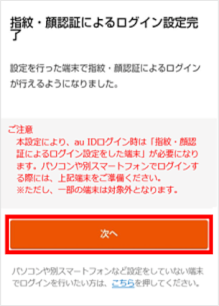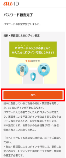 [次へ]をタップします。 この画面が表示されない場合は手順11へ進みます。 ※画面が進まない場合は生体認証(指紋・顔)などが未設定の可能性があります。生体認証(指紋・顔)または番号認証/パターン認証などの画面ロック登録をしていただくことで次の画面へ進みます。