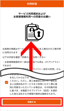 利用規約、同意事項の確認などを確認し、[同意する]をタップします。