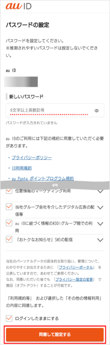 お好きなパスワードを入力し、[同意して設定する]をタップします。 ※UQ mobileのお客さまは、この次にメールアドレスの登録画面が表示されますので、画面に従い登録を行います。