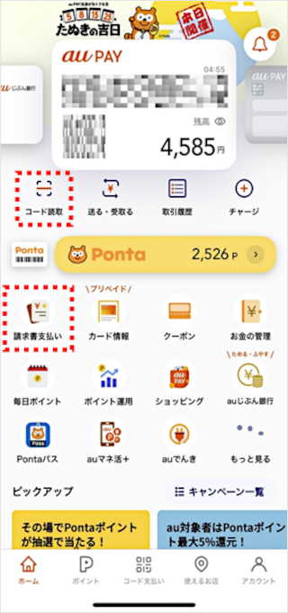 [コード読取]または[請求書支払い]を選択します。