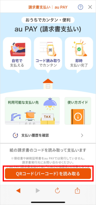 公共料金や、ショッピング代金などの請求書(払込票)をau PAY アプリのコードリーダーで読み取り、au PAY 残高で支払いができます。