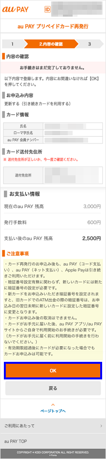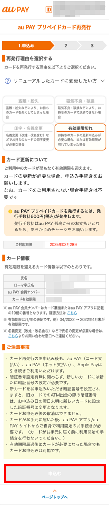 au PAY プリペイドカード再発行ページで、有効期限を更新した新しいカード(プラスチックカード)をお申し込みいただけます。