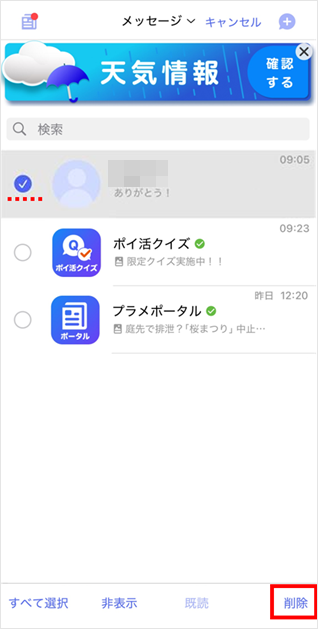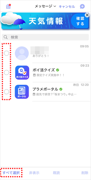 削除したい宛先をタップします。 ※すべてのメッセージを削除したい場合、[すべて選択]をタップします。