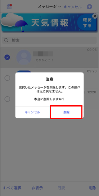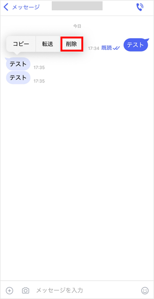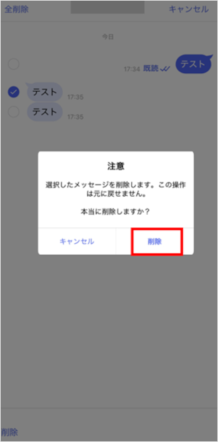 [削除]をタップします。 以上で削除が完了しました。 ※自分のスマートフォンで削除をしても、相手の端末では削除されません。