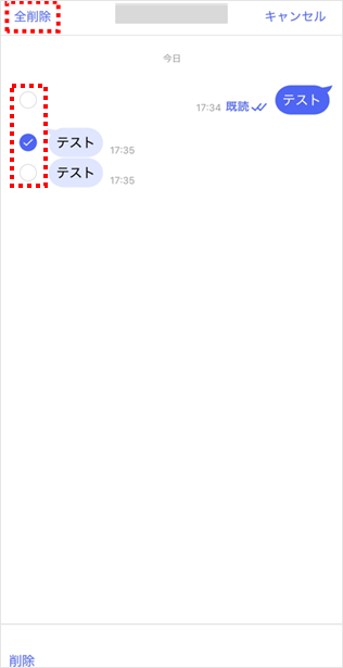 同時に削除したいメッセージがある場合は、タップして選択します。選択後、[削除]をタップします。 ※「全削除」をタップすると選択状態に関わらず、すべてのメッセージが削除されます。