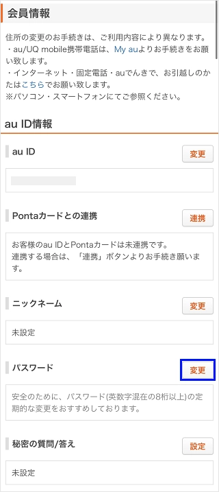 パスワードの変更は「au ID会員情報サイト」で手続きができます。