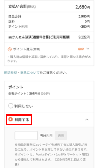 Pontaポイント(au PAY マーケット限定)は1ポイントが1円、auポイントは1.2ポイントが1円としてお買い物で利用できます。