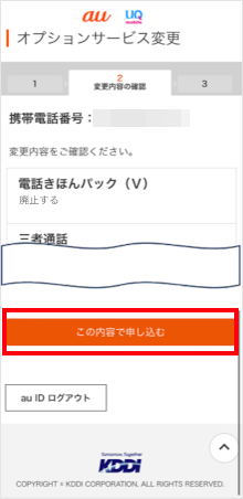 「電話きほんパック(V)」の[廃止する]にチェックを入れ、[同意して次に進む]をタップします。