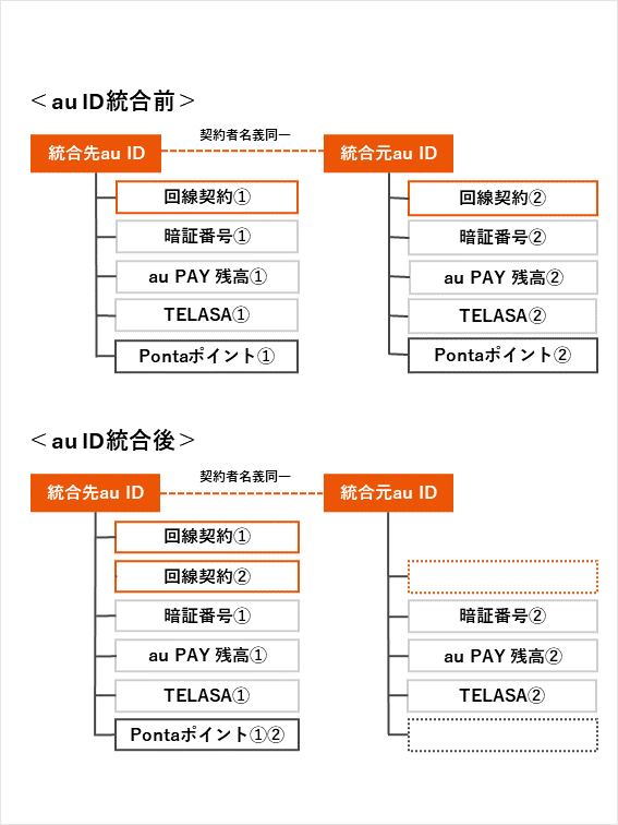 au ID統合前とau ID統合後で、以下のようにau IDやサービスの状態が変わります。