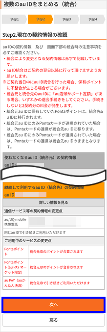 使わなくなるau ID/継続して利用するau IDの情報が表示されます。