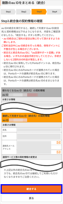au ID統合の注意事項と、継続して利用するau IDの情報(統合元の情報)が表示されます。