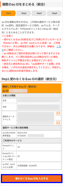 使わなくなるau ID/継続して利用するau IDの情報が表示されます。