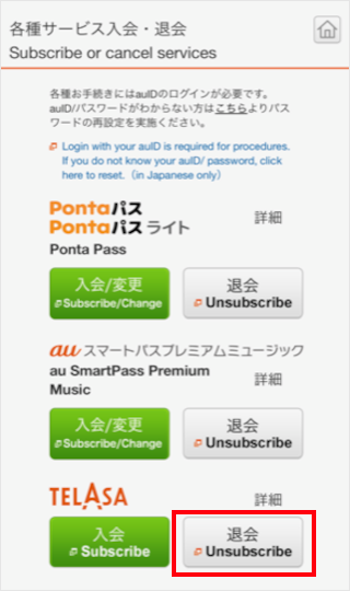 「各種サービス入会・退会」ページを開き、TELASA(旧ビデオパス)の[退会]をタップします。