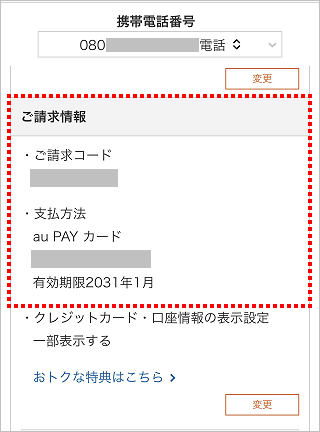 My au(Web)の「ご請求関連情報」欄で、現在の支払方法を確認できます。