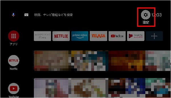 Android TV ホーム画面の「設定」でGoogle アカウントのログインができます。