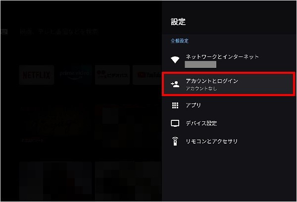 「アカウントとログイン」を選択し、リモコンの[決定]ボタンを押します。