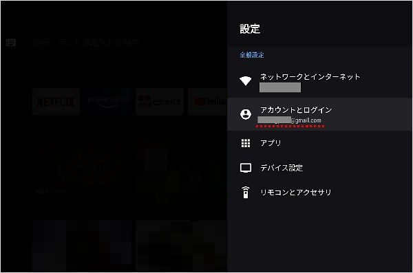 Android TV ホーム画面の「設定」でGoogle アカウントのログインができます。
