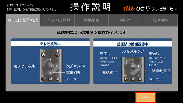 説明を確認したら[次へ]を選択し、リモコンの「決定」ボタンを押します。