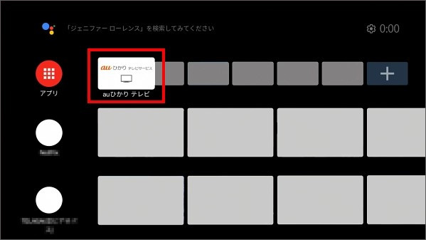 STA3000のAndroid TVホーム画面で、[auひかり テレビサービス]を選択します。