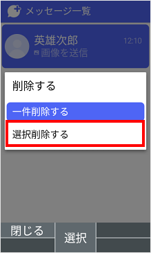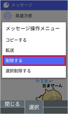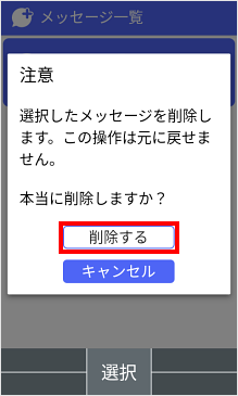 「削除する」を選択し、[選択(センターキー)]を押します。 ※複数選択する場合は、「選択削除する」を選択し[選択(センターキー)]を押す→削除するメッセージを複数選択し[削除(カメラキー)]を押します。