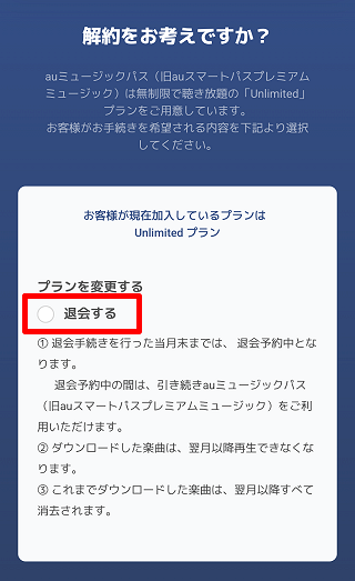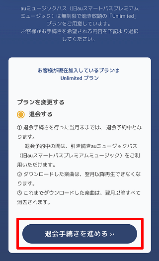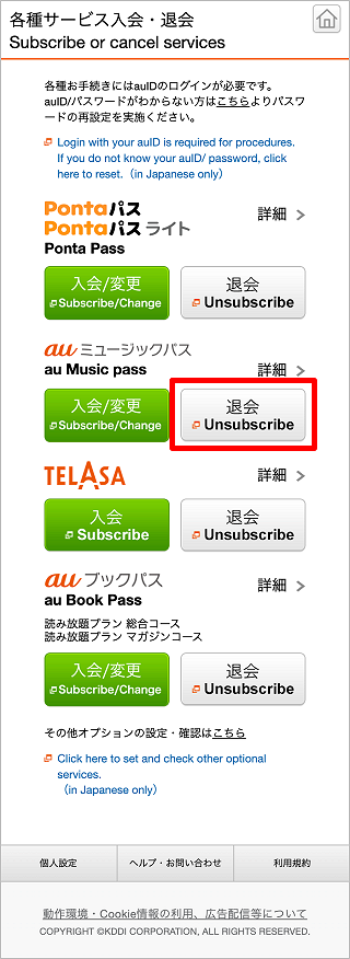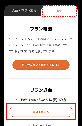 「各種サービス入会・退会」ページへアクセスの上、auミュージックパス(旧auスマートパスプレミアムミュージック)の[退会]をタップします。
