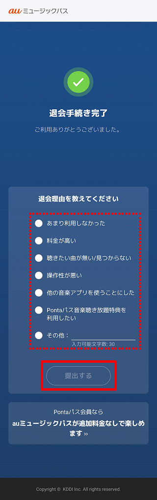 退会理由を選択し、[提出する]をタップします。