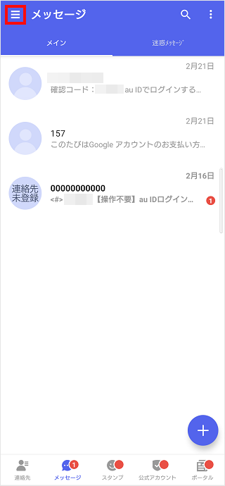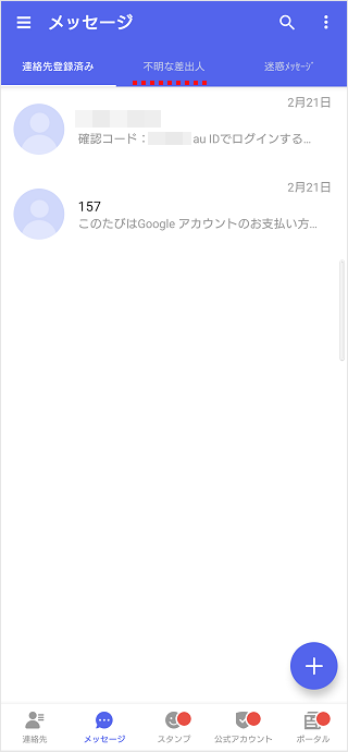 「+メッセージ(プラスメッセージ)」アプリでは、電話帳に登録している相手からのメッセージと、電話帳に未登録の相手からのメッセージを振り分けて表示することができます。