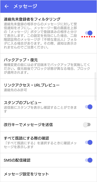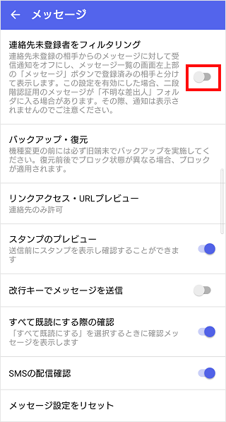 「連絡先未登録者をフィルタリング」はオンになりました。