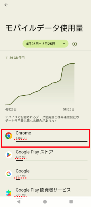 主に使用しているアプリが表示され、消費データ量を確認できます。